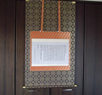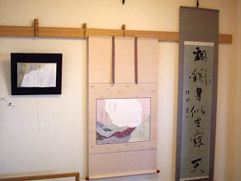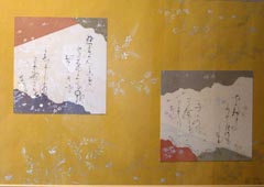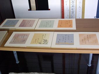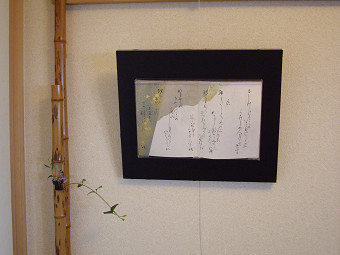 廊下(右の作品)には、王朝継ぎ紙に書いた和歌2首。 左の軸は、廊下手前の部屋の作品。 料紙のデザイン、制作も桂風庵主の自作!!模様は金銀泥で書いています。