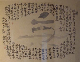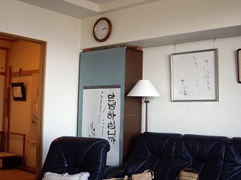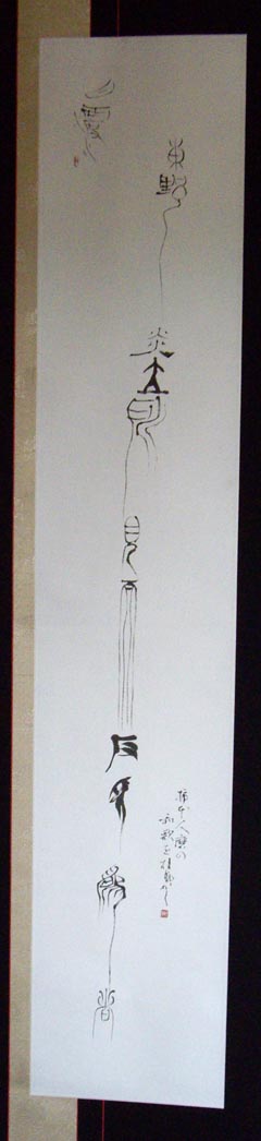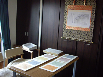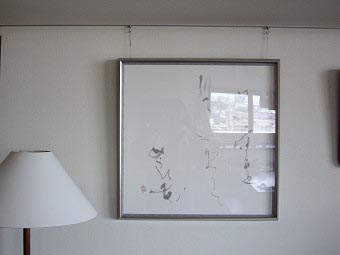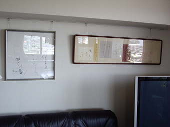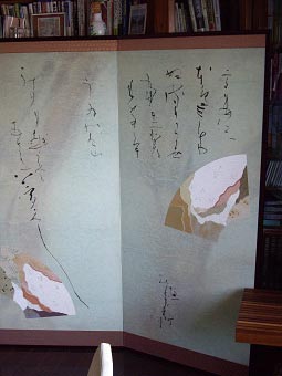 展示室風にしました。屏風で書棚を目隠し。 机の上には三十六歌仙の和歌を貼りこんだ折帖を飾りました。 ↓この作品は、柿本人麻呂の歌を篆書でアレンジ。読めますか?「東の野に炎の~ 」 ![]() |