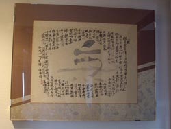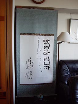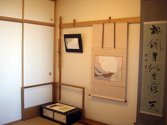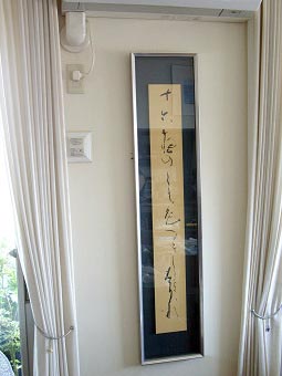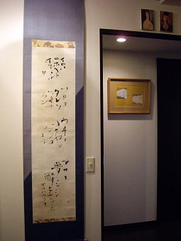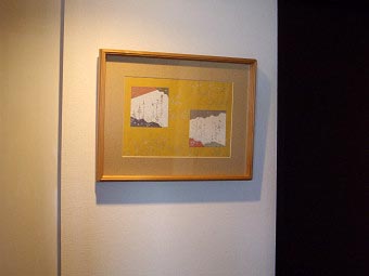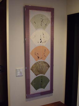 まずは玄関に・・・ 入り口右、白い壁に扇面が映えます。 正面の飾り棚の上に「いろは歌」の1節。料紙が華やかです。